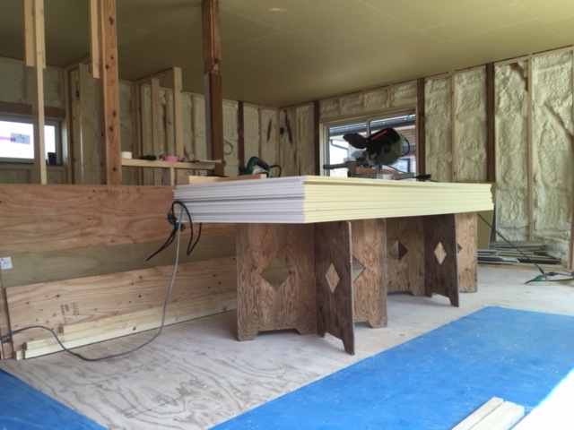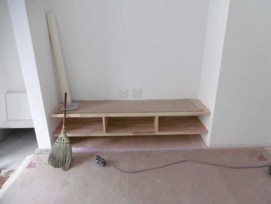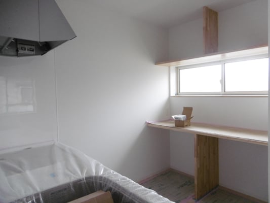 ⑩クロス作業が完了。毎度おなじみのキッチン背面の作業台のほか、今回はテレビ台も造作しました。