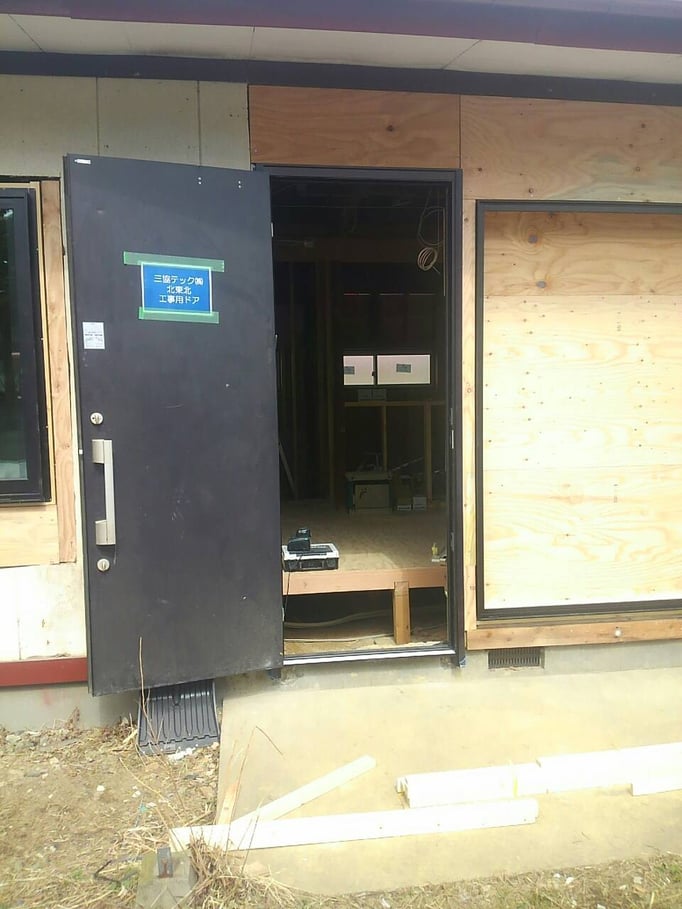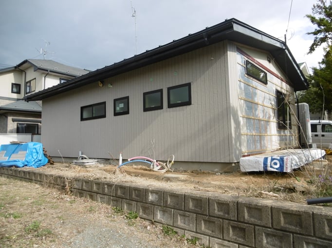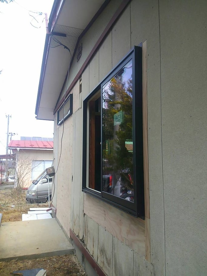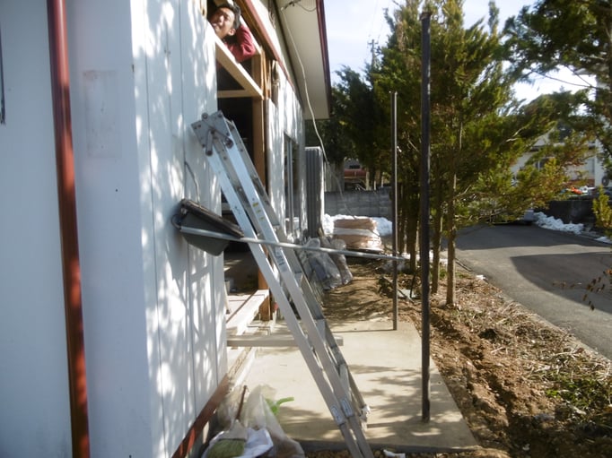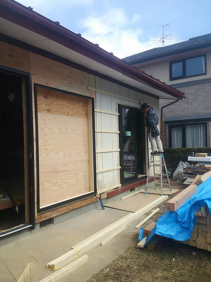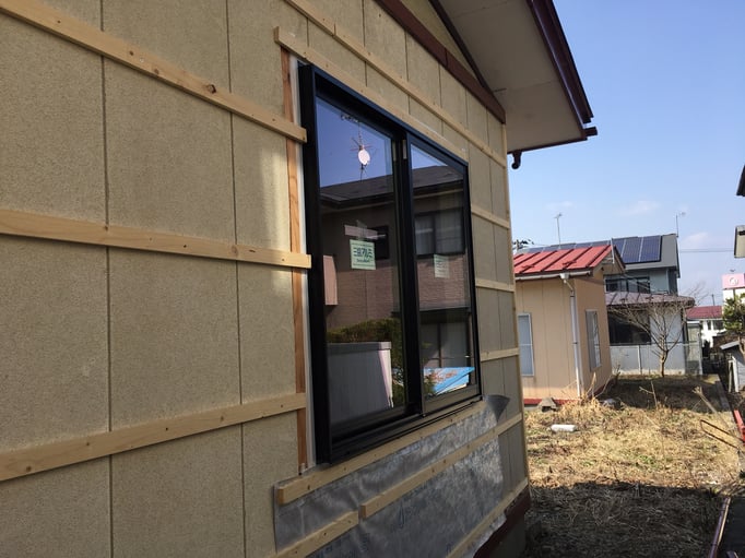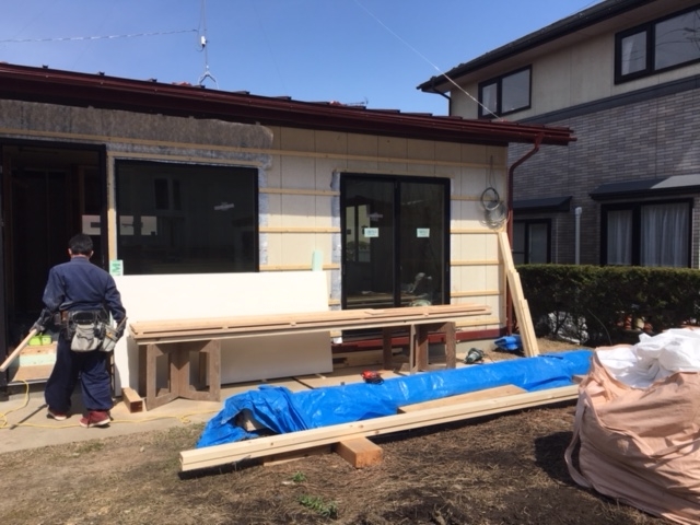 ④新しいサッシや工事用玄関ドアが設置され、外壁張りの作業も同時進行。