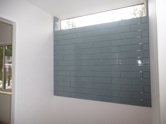 洗面台上部には採光窓。壁面はタイル貼りで仕上げ。