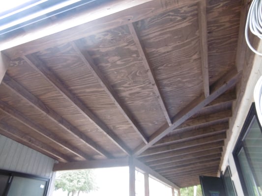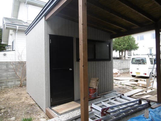 軒の塗装が完了、ウッドデッキと合わせました。小屋にも外壁が張られ、外水道も引っ張り、完成が近いです。
