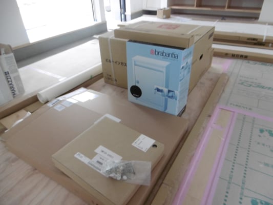 洗面室のタイル、ここにかかる予定の鑑や玄関ポストはリビング中央で出番を待っています。