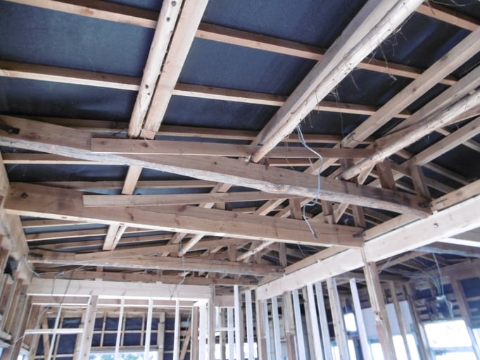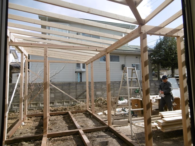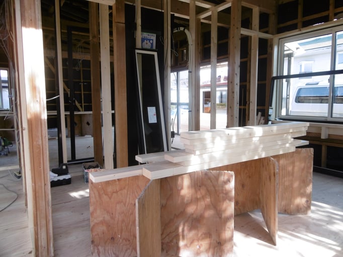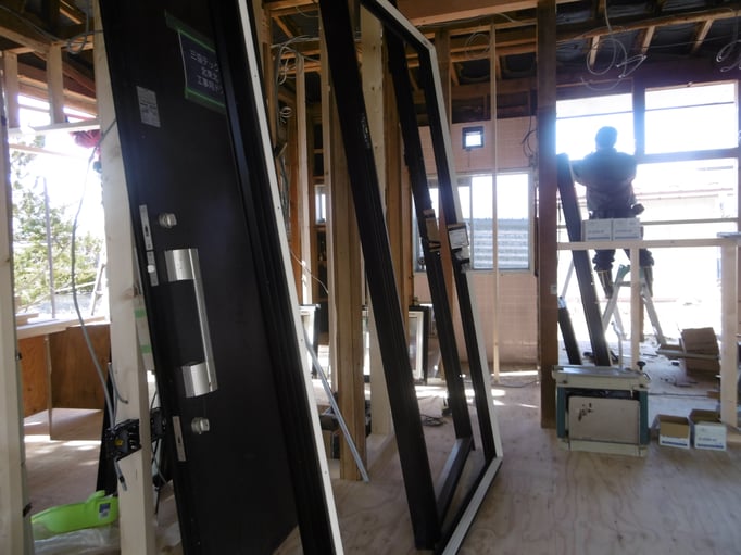 サッシや木材、断熱材が出番を待ちながら大工さんを見守ります。